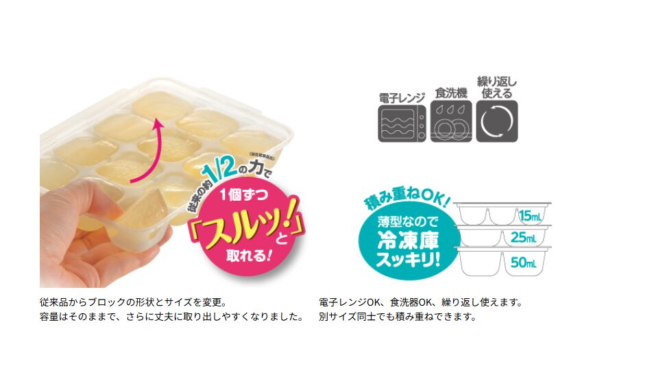 本当に初めの頃は、製氷機や100均の小分け容器を使っていましたが、なんせ凍らすとガンガンしてもなかなか取れない…